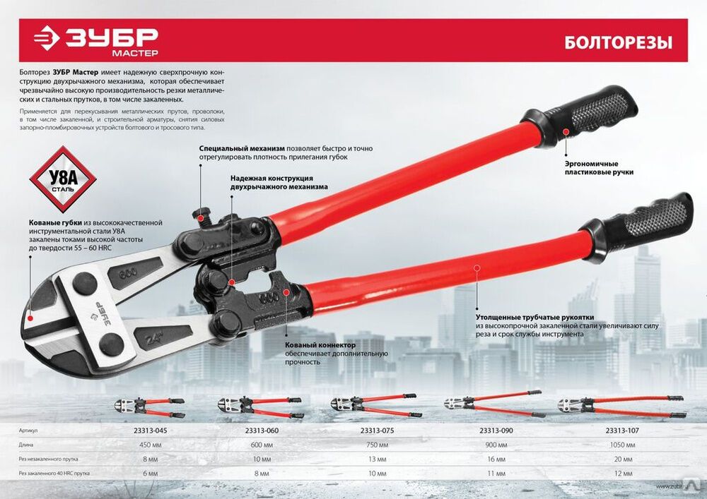 Надежная конструкция двухрычажного механизма и применение высокопрочной закаленной стали в рукоятках болторезов увеличивает силу реза и срок службы ин