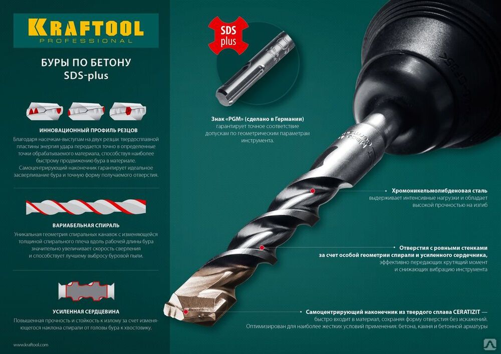Буры по бетону SDS-Plus KRAFTOOL серии EXPERT - сила и точность там, где они нужны. Применяются при сверлении отверстий в бетоне, граните, кирпичной кладке, камне и твердых известняках.