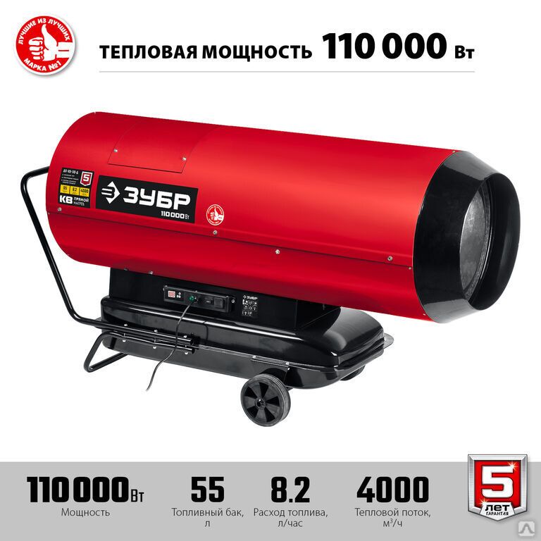 Высокоэффективный дизельный теплогенератор прямого нагрева работающий на дизельном топливе для всех климатических условий. Оптимально подходит для сушки и прогрева на строительных площадках складских комплексов и проветриваемых помещений. Надежный поджиг и эффективное горение гарантируют безотказную подачу тепла в любых условиях эксплуатации. ЗУБР - тепло всегда и везде
