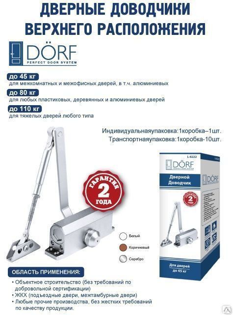 Читать все статьиДоводчик дверной морозостойкий 45кг Дорф белый