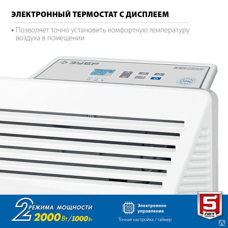 Электрический конвектор ЗУБР ПРОФЕССИОНАЛ мощностью 2000 Вт - подойдет для обогрева любых домашних и офисных помещений площадью до 25 м2. Электронный терморегулятор и ионизация воздуха обеспечит равномерный нагрев помещения и создаст неповторимую атмосферу комфорта.