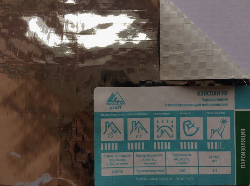Изоспан FS — теплоотражающая гидро-пароизоляция, изготовленная из полипропилена — нетканого полотна, продублированного плёночным металлизированным слоем.