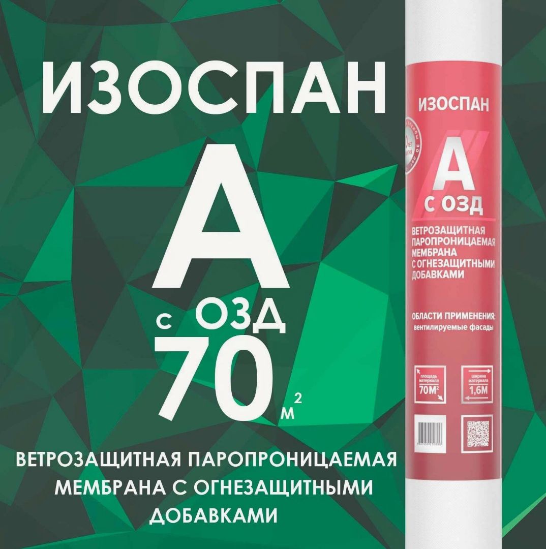 Изоспан A ОЗД — ветрозащитная паропроницаемая мембрана с огнезащитными добавками. Это термоскрёпленный полипропиленовый нетканый материал, в состав которого входят огнезащитные добавки (антипирены).