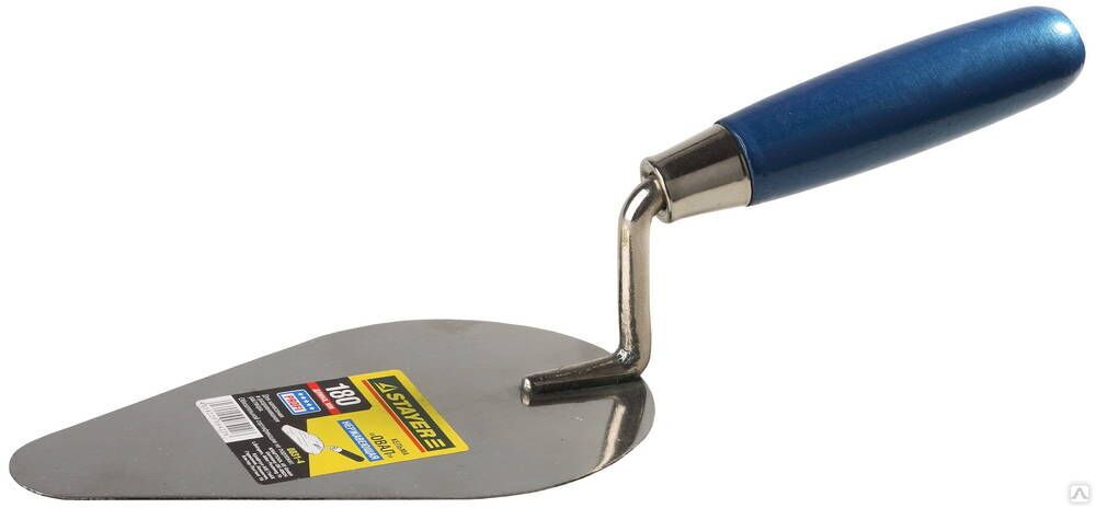 кельма используется для нанесения строительных растворов, нержавеющее стальное полотно обеспечивает прочность конструкции, а двухкомпонентная ручка удобство в работе