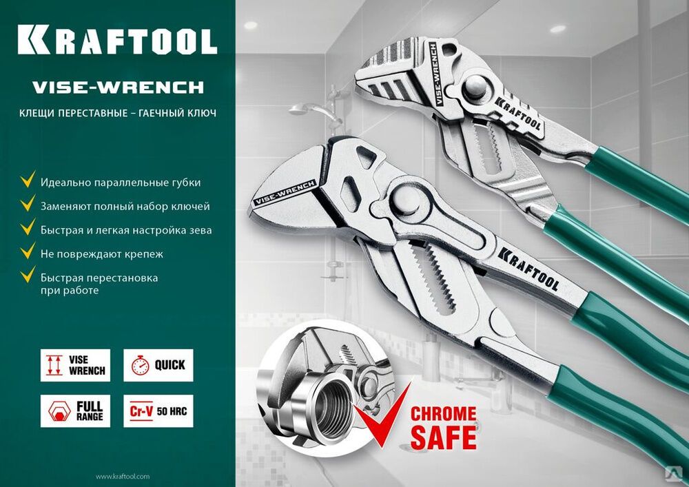 Клещи переставные-гаечный ключ KRAFTOOL – профессиональный инструмент с постоянно параллельными губкам. Заменит набор из всех ключей и обеспечит полную сохранность хромированного крепежа.