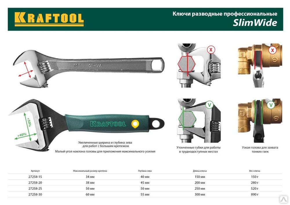 Читать все статьиКлюч разводной SlimWide, 300 / 60 мм, KRAFTOOL