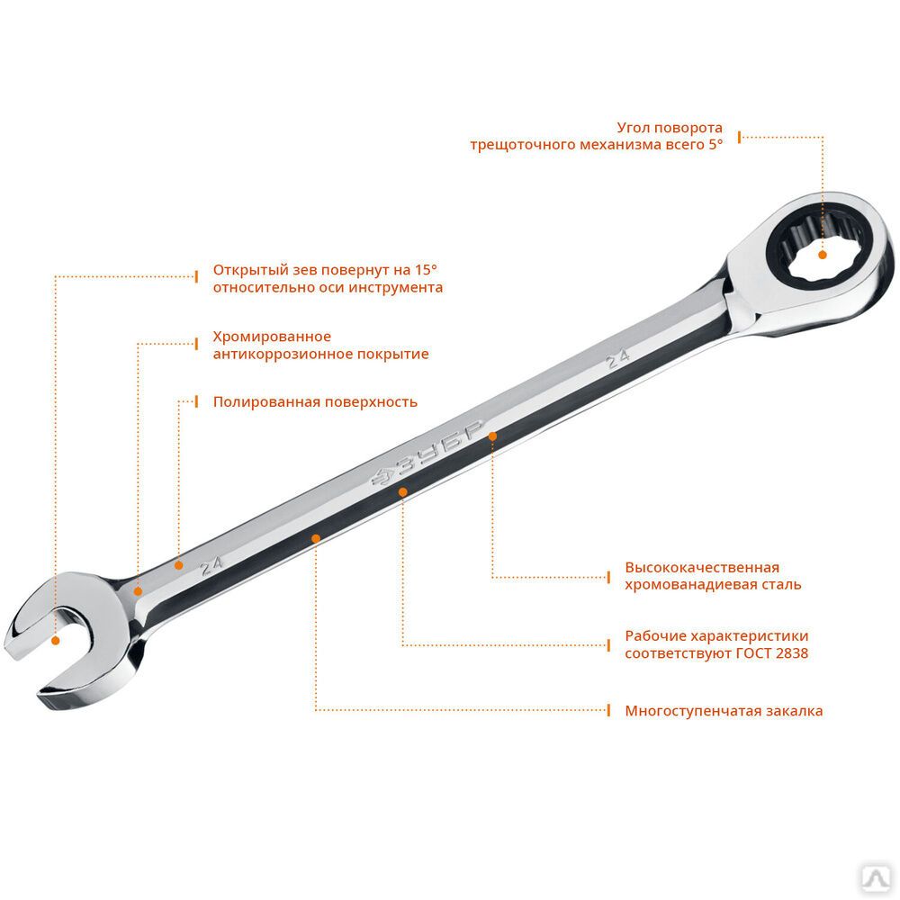 Читать все статьиКомбинированный гаечный ключ трещоточный 24 мм, ЗУБР
