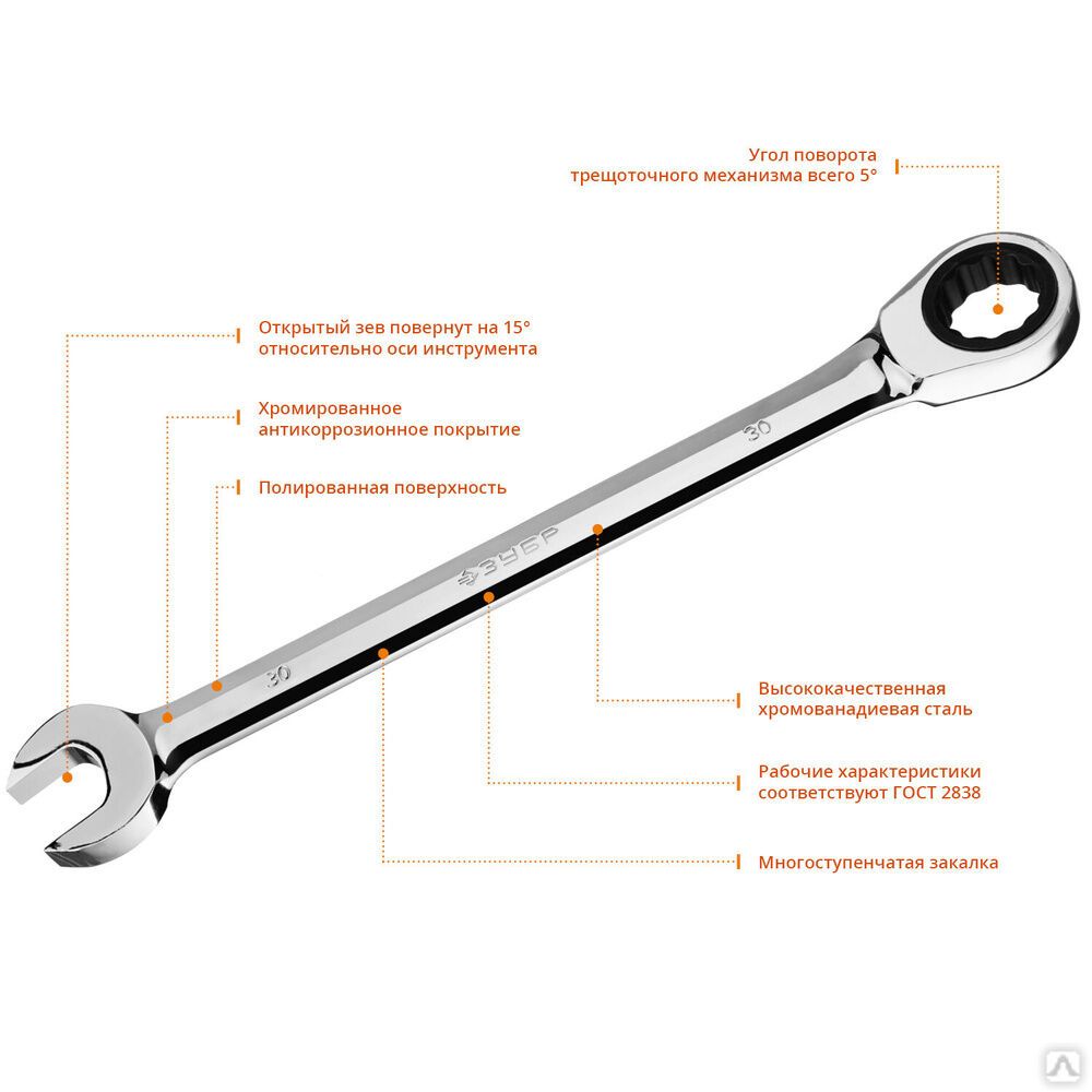 Читать все статьиКомбинированный гаечный ключ трещоточный 30 мм, ЗУБР