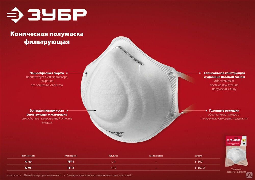 Читать все статьиКоническая фильтрующая полумаска ЗУБР Ф-80, класс защиты FFP1