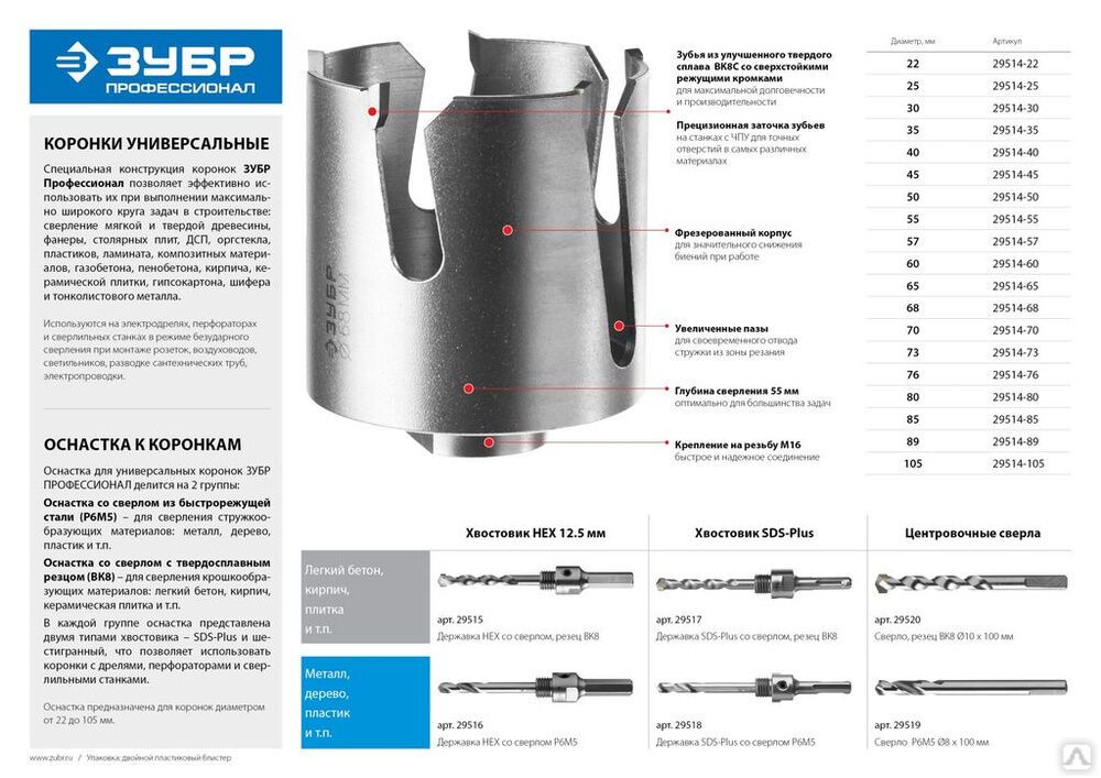 Читать все статьиКоронка с твердосплавными резцами ЗУБР ПРОУНИВЕРСАЛ 55 мм