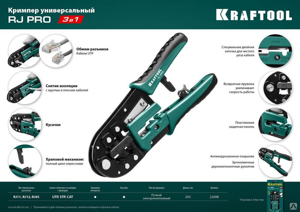 Читать все статьиКримпер универсальный RJ-Pro, RJ45, RJ11/RJ12, KRAFTOOL