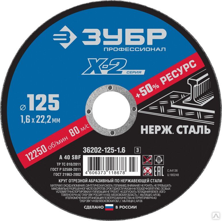 Читать все статьиКруг отрезной X-2 по нержавеющей стали, 125х1,6х22,23 мм, ЗУБР