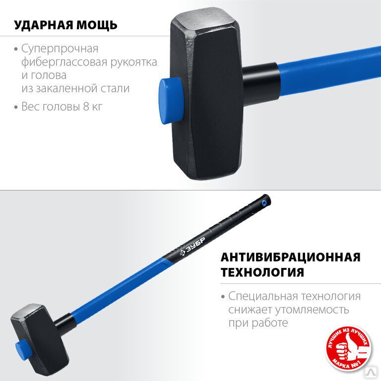 Профессиональная кувалда ЗУБР оснащена особопрочной фибергласовой рукояткой. АВТ - технология позволяет существенно снизить вибрации, возникающие во время удара, что делает работу с инструментом более комфортной. Соответствует требованиям ГОСТ 2310-77.