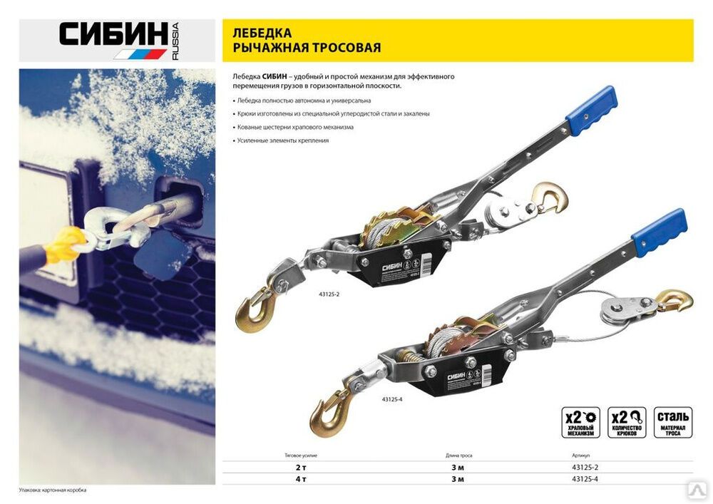 Читать все статьиЛебедка ручная рычажная СИБИН, тросовая, 2т, 3 м