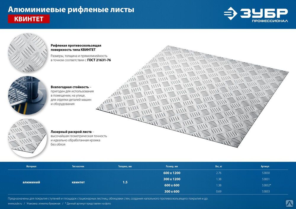 Читать все статьиЛист рифленый алюминиевый ЗУБР Квинтет 300х1200 х1,5 мм