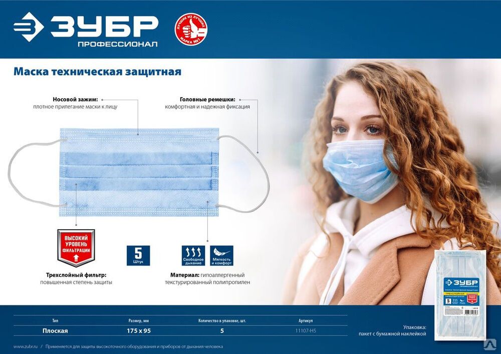 Читать все статьиМаска техническая защитная, гигиеническая, трехслойная ЗУБР 5 шт