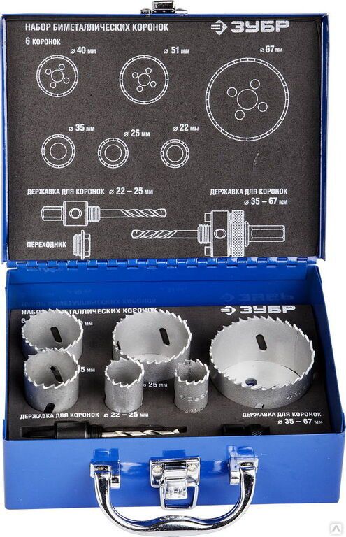 Читать все статьиНабор коронок биметаллических 22,25,35,40,51,67 ЗУБР 6 шт