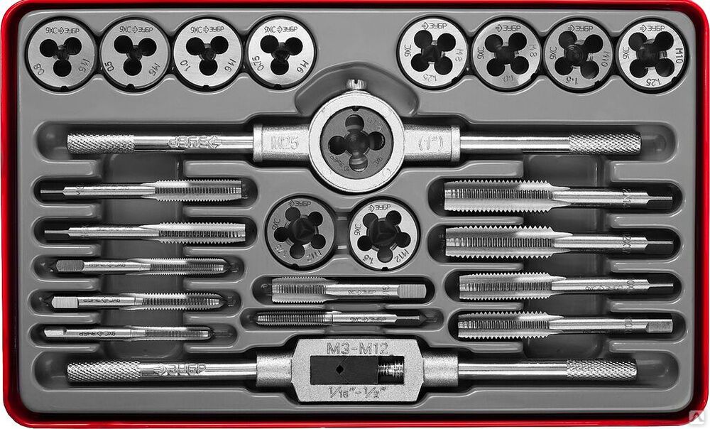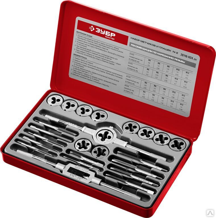 Читать все статьиНабор метчиков и плашек, сталь 9ХС ЗУБР 24 предмета