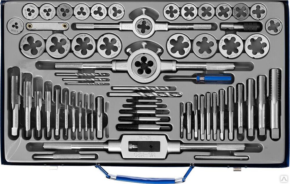 Читать все статьиНабор метчиков и плашек, сталь Р6М5 ЗУБР 65 предметов