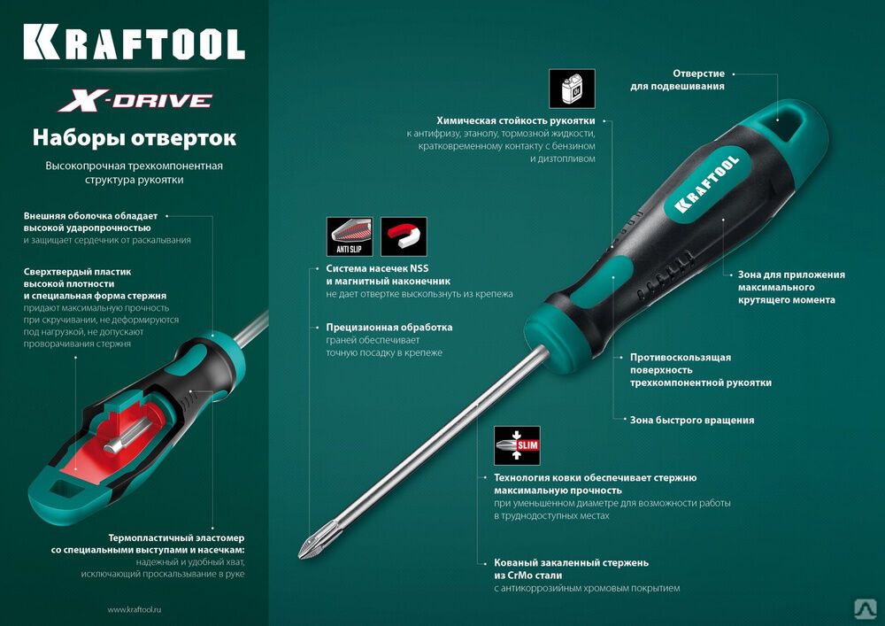 Профессиональные отвертки KRAFTOOL X-Drive изготовлены из высокопрочной Cr-Mo стали. Специальная закалка стержня и система насечек NSS обеспечивают удобство работы и длительный срок службы