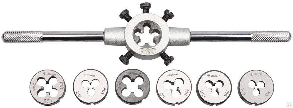 Набор предназначен для резьбонарезных работ в конструкциях и заготовках из сталей и цветных металлов. Плашки предназначены для нарезания внешней метрической резьбы с нормальным шагом.