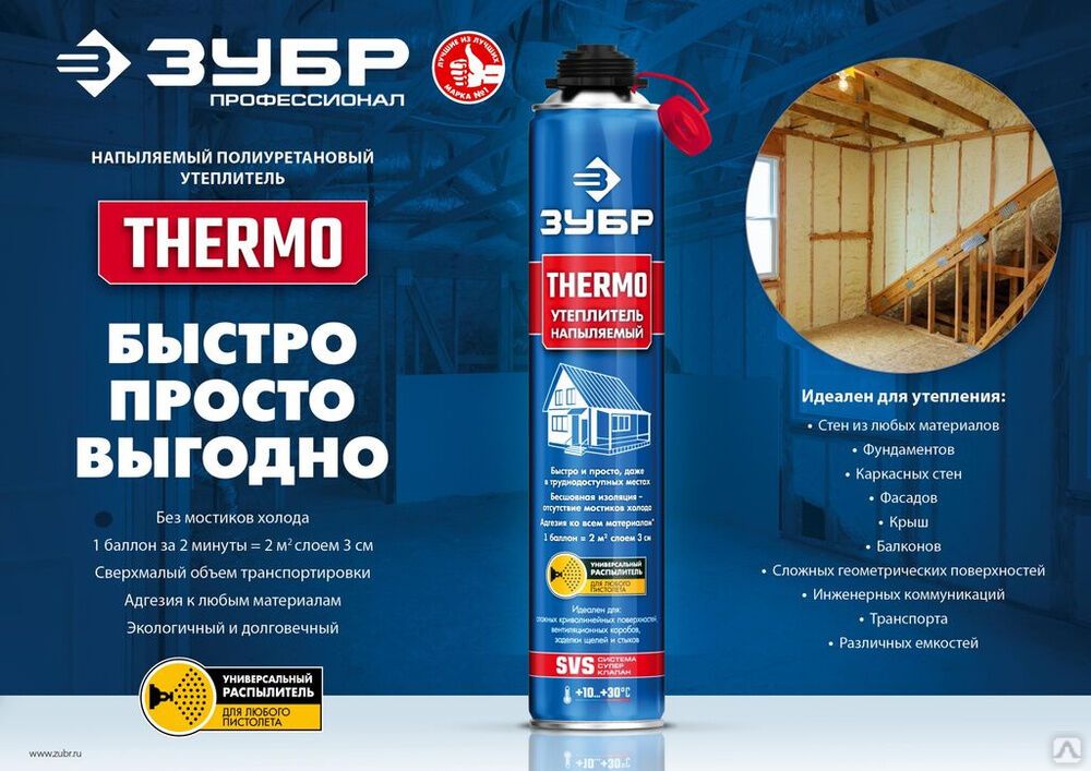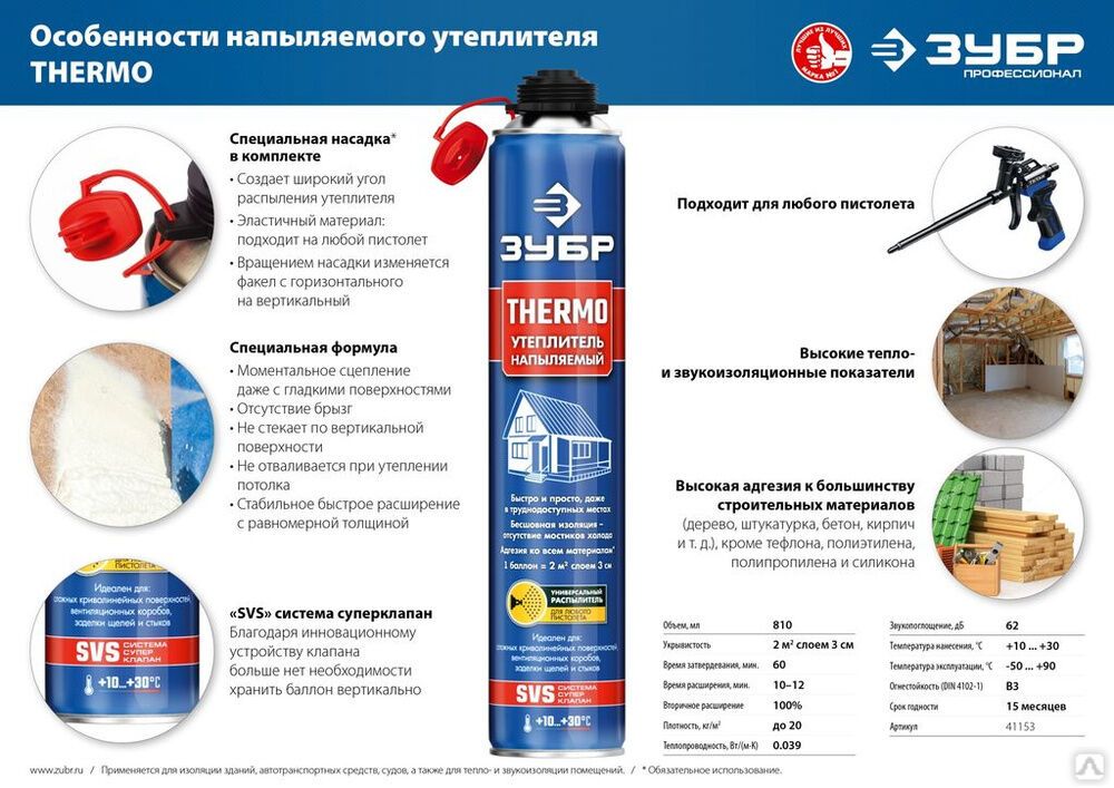 Читать все статьиНапыляемый полиуретановый утеплитель, профессиональный, пистолетный, 810 мл, SVS, ЗУБР THERMO