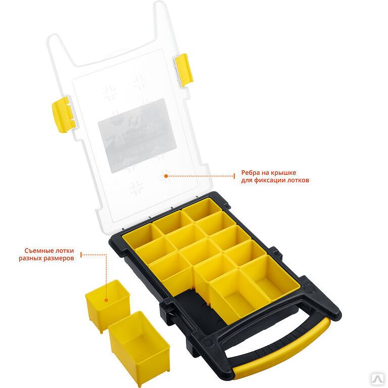 Съемные лотки органайзера позволяют организовать удобное хранение и переноску принадлежностей к инструментам