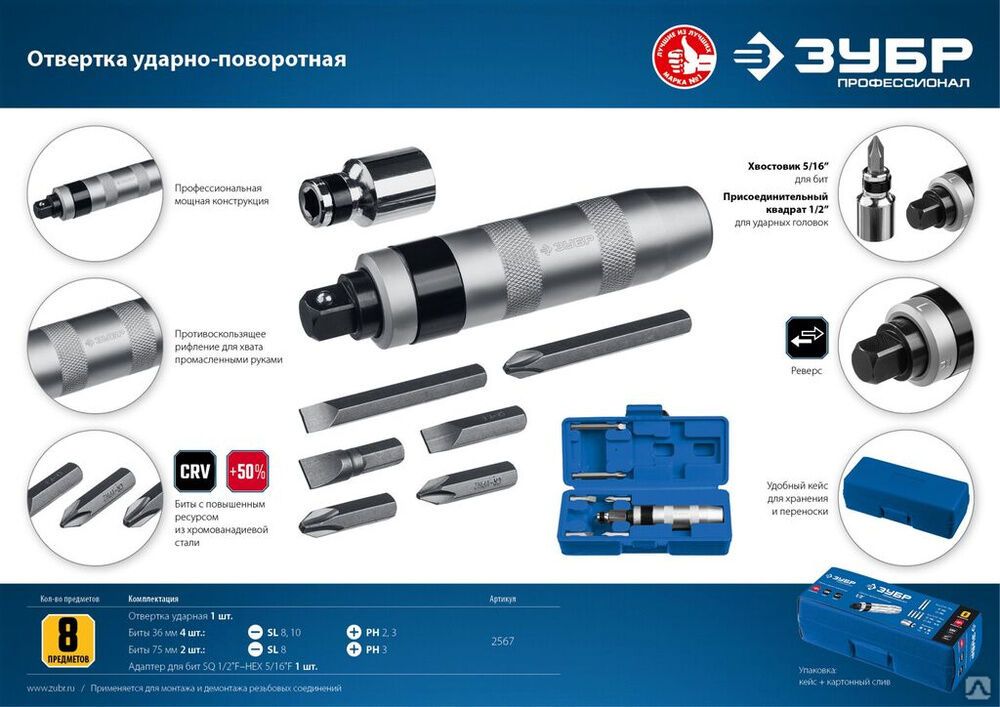 Читать все статьиОтвертка Профессионал ударно-поворотная 8 предметов ЗУБР