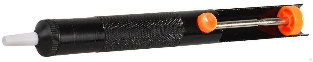 Корпус шприца металлический. Шприц применяется совместно с электропаяльником для удаления оловянно-свинцового припоя с печатных плат и других мест пайки. Пригоден как при выпаивании электронных элементов и проводников, так и при последующей зачистке платы. • Припой засасывается в шприц автоматически при нажатии на кнопку фиксатора • Застывший припой затем удаляется штоком из сопла шприца повторным нажатием на колпак