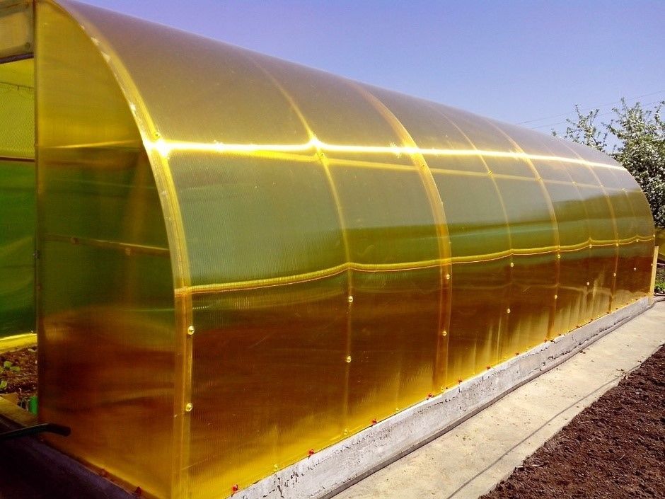 Сотовый поликарбонат - современный материал для строительства теплиц. Лёгкий пластик не нагружает несущую конструкцию, прекрасно защищает растения от холода, дождя, града, создает благоприятные условия для роста растений. Преимущества - Прозрачный пластик пропускает 80-88 процентов солнечного света и мягко рассеивает его. - Покрытие пропускает только полезный красный спектр, что приводит к увеличению урожая в 2,5 раза. - Материал устойчив к ударам, при разломе не образует травматичных осколков. - Поликарбонат легко гнётся, может устанавливаться на теплицы любой конфигурации. Область применения Сотовый поликарбонат используется для обустройства сезонных теплиц в частных и фермерских хозяйствах.