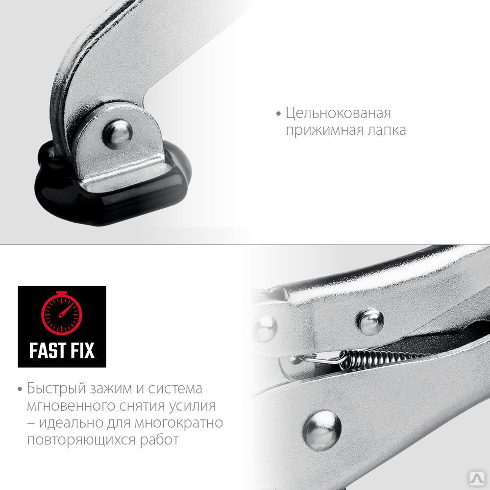 Профессиональная быстрозажимная струбцина KRAFTOOL для сварочных, слесарных, столярных и других работ, где требуется бысрое и надежное крепление заготовок. Усиленная конструкция из прочной хроммолибденовой стали. Цельнокованая прижимная лапка. Прижимное усилие до 400 кгс. Обрезиненный наконечник для бережной фиксации мягких заготовок. Инновационная система мгновенного снятия зажима. Система быстрой настройки толщины зажимаемой детали на всем диапазоне инструмента. Широкая площадка с пятью отверстиями для максимально надежной фиксации струбцины на рабочем столе.