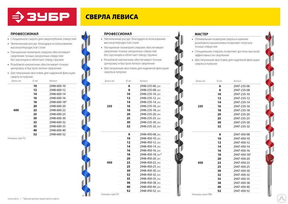 Читать все статьиСверло левиса по дереву ЗУБР 10x235/160 мм, шестигранный хвостовик