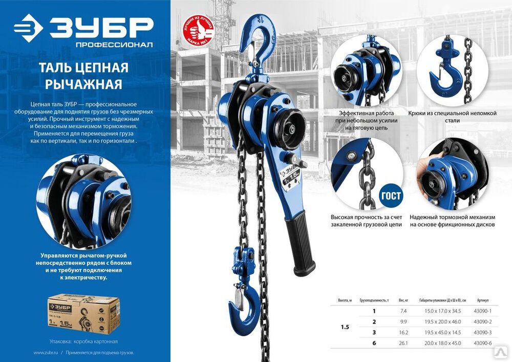 Читать все статьиТаль цепная ЗУБР Профессионал рычажная, 1т/1,5 м