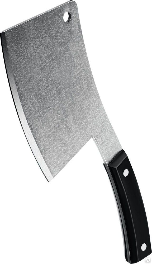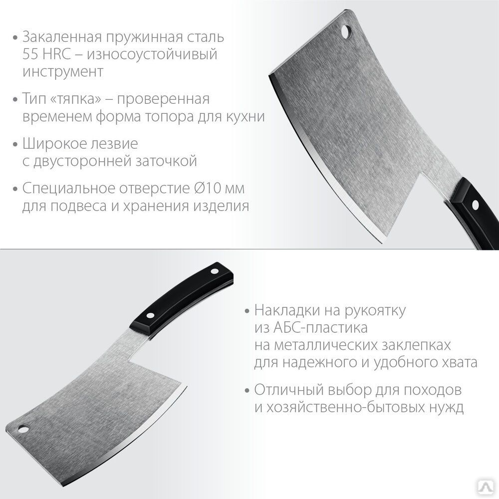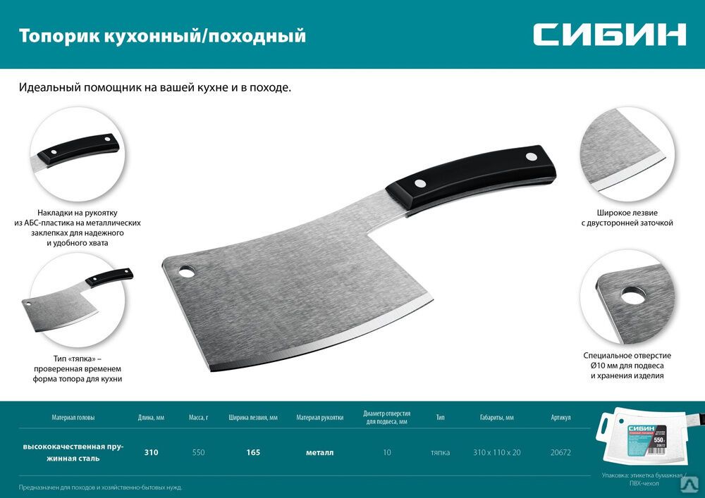 Кухонный топорик СИБИН идеальный помощник за столом и походе! Пружинная сталь, закален до 55 HRC. Округлое лезвие. Защитное антикоррозионное покрытие. Рукоятка из АБС пластика на заклепках из металла. Тип тяпка - проверенная временем форма топора для мяса. Готовое отверстие Ø 10 мм для подвеса и хранения. Отличный выбор для походов и хозяйственно-бытовых нужд.