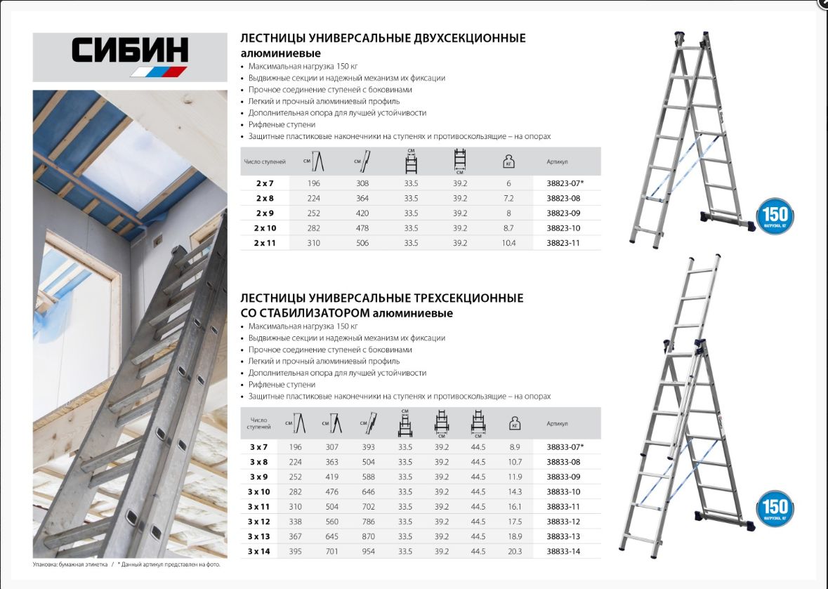 Характеристики Гарантия нет Материал алюминий Число ступеней 3х10 Максимальная нагрузка, кг 150 Максимальная высота, см 646 Высота одной секции, см 282 Ширина первой секции, см 33.5 Ширина второй секции, см 39.2 Ширина стабилизатора, см 90 Высота двух секции лестницы, см 476 Ширина третьей секции, см 44.5
