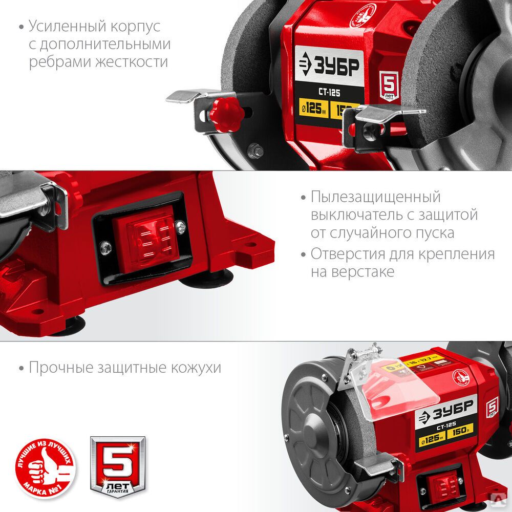 Станок заточной ЗУБР СТ-125 – незаменимый инструмент для гаража, мастерской и используемый для заточки и сухой шлифовки металлических заготовок и режущего инструмента. Простота конструкции, высокая надежность, компактный размер, два камня с разной зернистостью – все что нужно для настоящего мастера, ценяще-го качество и рассчитывающего на долгий срок службы