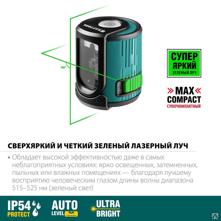 Профессиональный измерительный инструмент для высококачественного выполнения разметочных работ даже в неблагоприятных условиях: ярко освещенных, затемненных, пыльных, влажных помещениях – благодаря лучшему восприятию человеческим глазом длины волны диапазона 515–525 нм (зеленый свет)